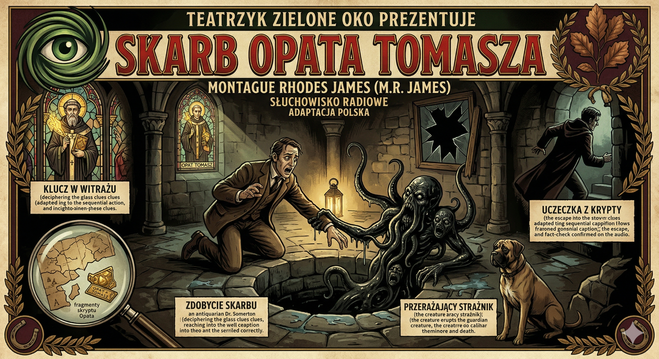 „Skarb opata Tomasza” jest klasyczną adaptacją opowiadania jednego z największych mistrzów grozy Montague Rhodesa Jamesa. Słuchowiska oparte na prozie M.R. Jamesa zawsze charakteryzują się narastającym, dusznym nastrojem i konfrontacją racjonalnego świata nauki z pradawnym, niewyobrażalnym horrorem.